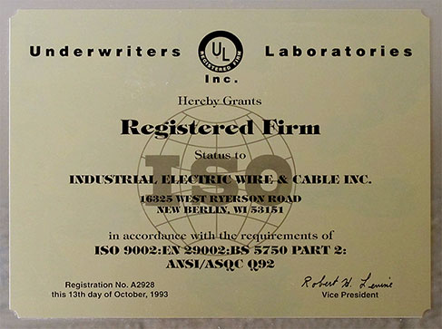 Industrial Electric Wire & Cable is registered to ISO through Underwriters Laboratory.