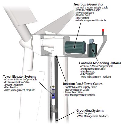 The wire and cable you choose plays a critical role in the reliability and efficiency of wind turbines. IEWC offers control and motor supply cable, instrumentation cable, power lead wire, flexible cord, fiber optics, bare copper and wire management products for the following applications: gearbox and generators, control and monitoring systems, tower elevator systems, junction boxes, tower cables and grounding systems.